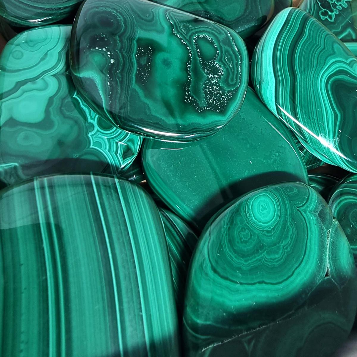 Carbonate basique de cuivre. Puissante, dense et opaque, elle absorbe l'énergie négative ; elle peut être appliquée sur les endroits du corps remplis d'énergie négative. La couleur verte de la Malachite, comme toutes les pierres verte, nous relie à la spiritualité de la nature et au chakra du coeur; la Malachite fait circuler et digérer les émotions, elle soigne la mémoire émotionnelle. Nettoyer fréquemment.